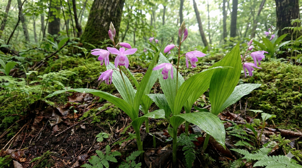 Nas encostas úmidas da Ásia, a Bletilla aprendeu a lidar com variações de temperatura que fariam outras plantas desistirem. Ela possui pseudobulbos achatados que parecem pequenos bulbos de cebola, escondidos logo abaixo da superfície do solo. É ali que ela guarda energia para brotar com força total assim que a primavera dá as caras, suportando até geadas leves se estiver bem protegida.
