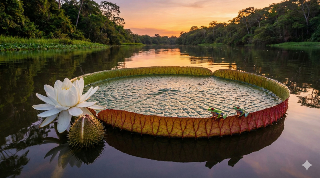 Ela se destaca pelo formato circular gigante, chegando a dois metros de diâmetro, e por uma estrutura que parece engenharia de primeira. Essa planta nativa vive nos rios de águas calmas, abrindo flores que mudam de cor e perfumam a mata no silêncio da noite.